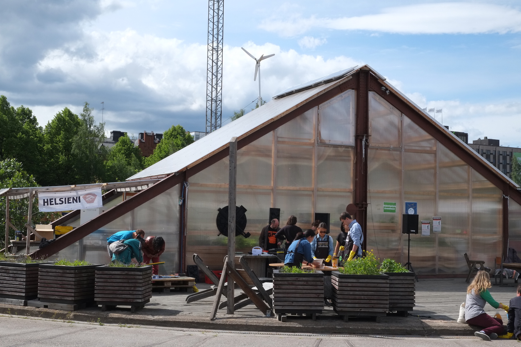 The Open Source Circular Economy Days 2016 in Helsinki, Finland was held on June 11th. An estimated 100 visitors and participants came to the old railyard (Veturitallit in Pasila) to enjoy a day of discovering, making and learning. The venue was an old train turntable (kaantopoyta ) which has been converted into an urban experimental urban greenhouse. The greenhouse is managed by the ngo Dodo to showcase urban farming methods and off-grid energy system. The whole system generates its own energy from solar pv, wind and a battery bank which powered all of the nearby workshops. The event was sponsored by the Tiina ja Antti Herlinin Foundation & Open Knowledge Finland .